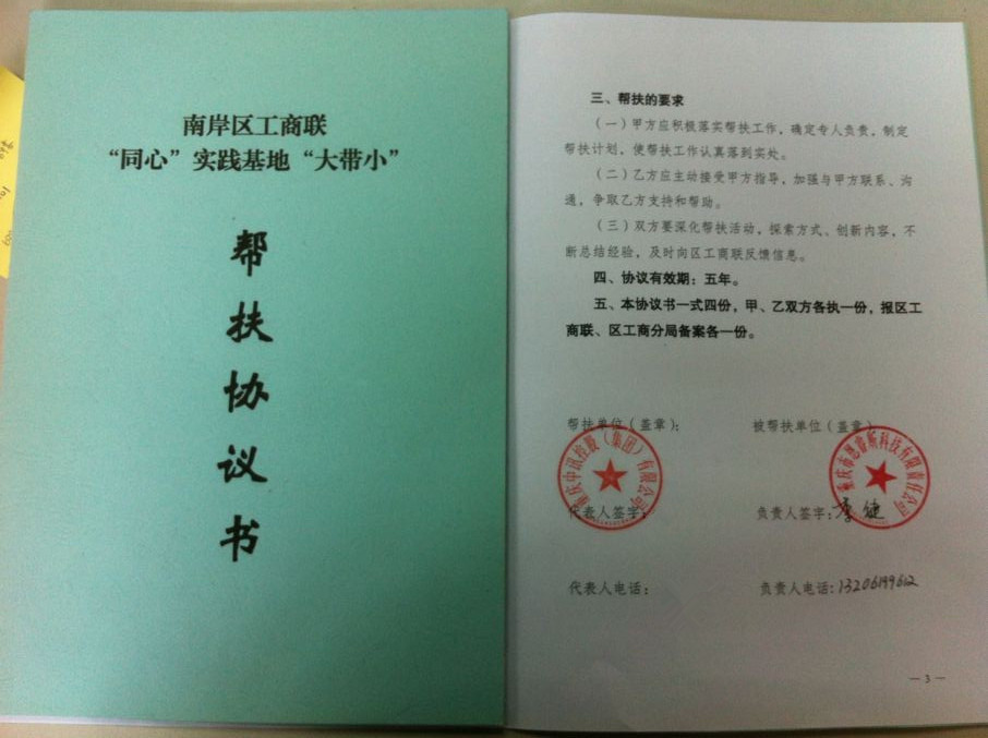 為認(rèn)真貫徹落實“同心”思想,引導(dǎo)幫扶微小企業(yè)健康發(fā)展。中訊控股集團(tuán)在南岸區(qū)工商聯(lián)的見證下于2012年5月與重慶市長靚光電科技有限公司、重慶市恩睿斯科技有限公司等4家微小企業(yè)簽訂幫扶協(xié)議。